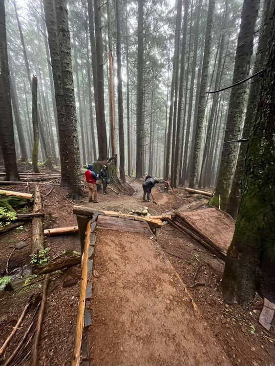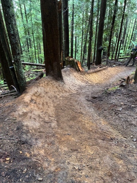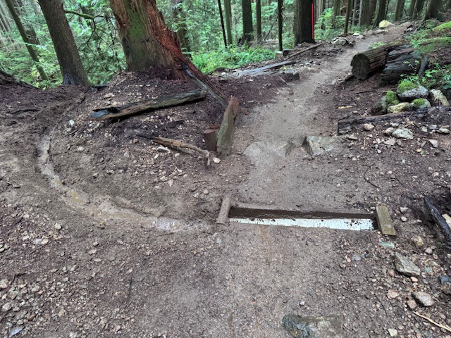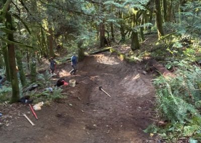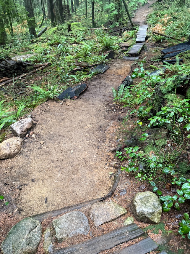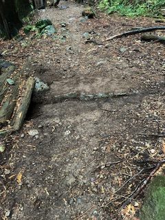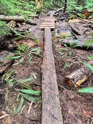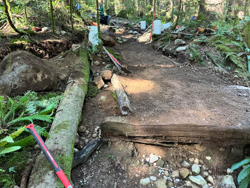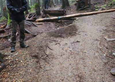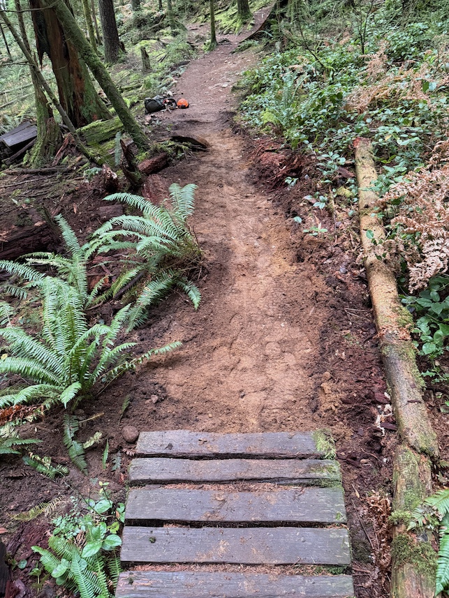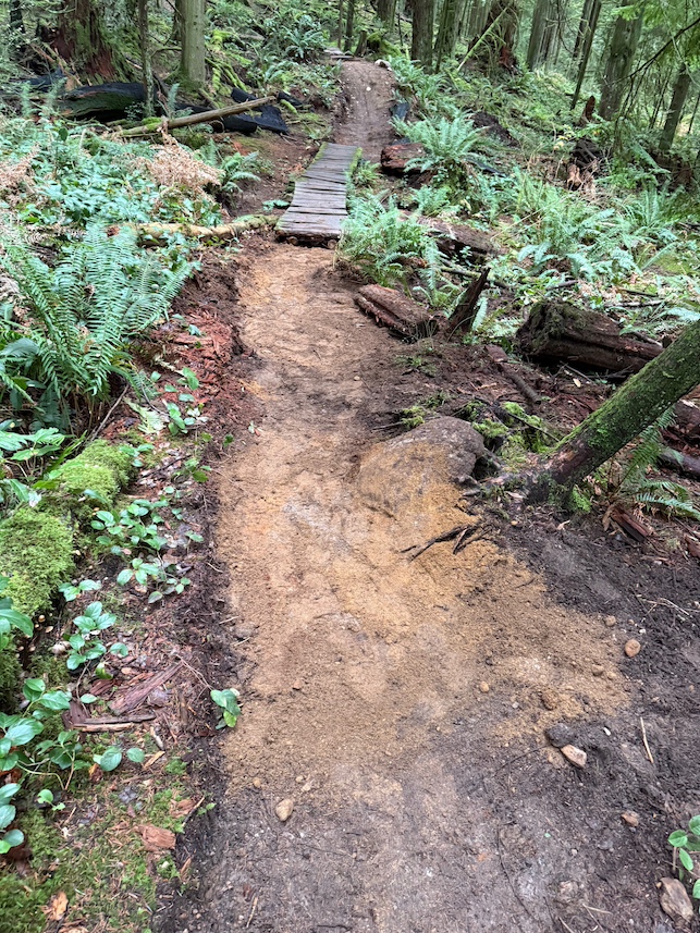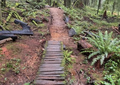 Small grade reversal to very muddy corner. Built new water drainage on said corner. The bulk of the time was spent rebuilding a wooden bridge feature, after the skinny. Planted ferns on either side of skinny. Helped drainage of puddles. Added a few rocks and dirt on exit of wooden features. Thanks for the wood prep Trail Crew!!!!