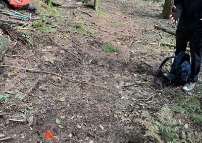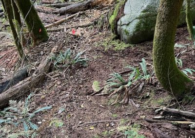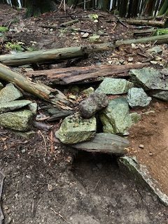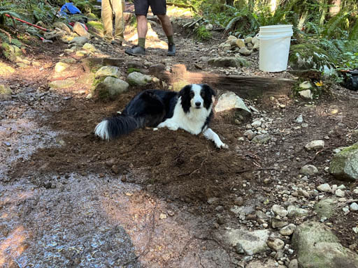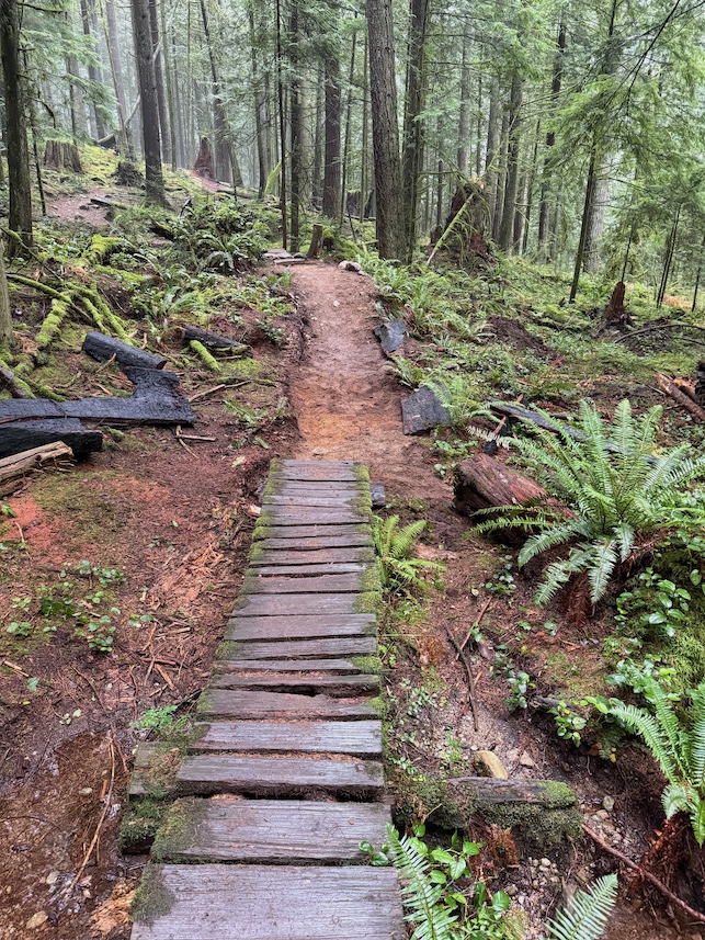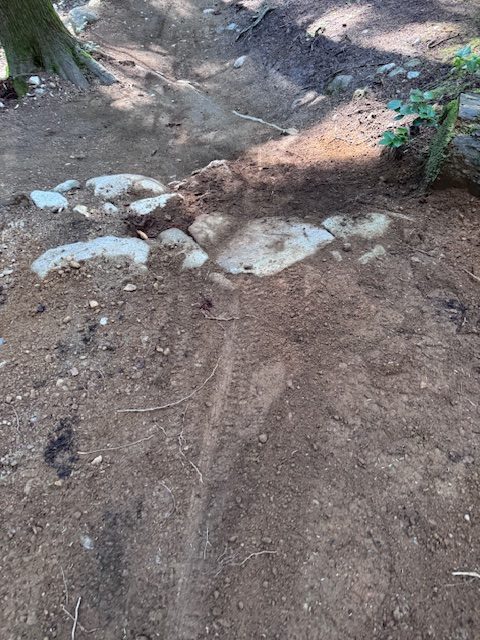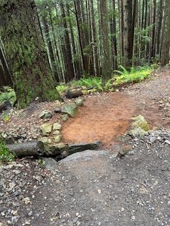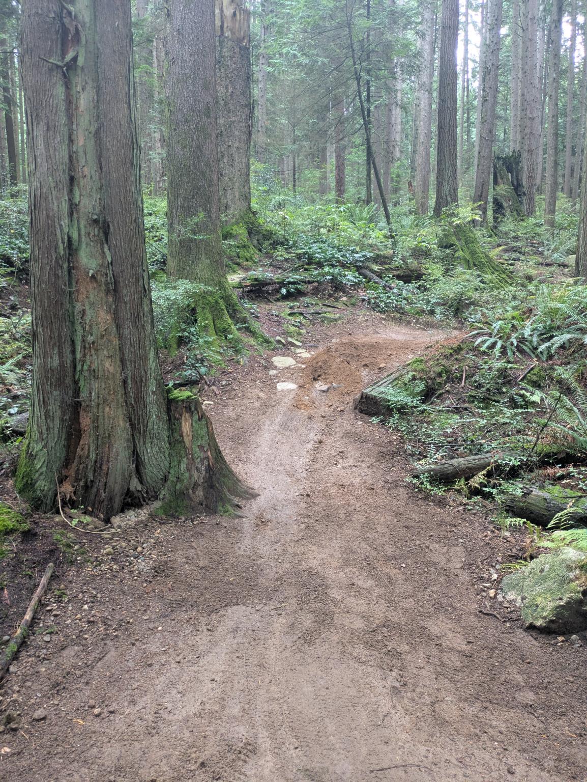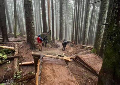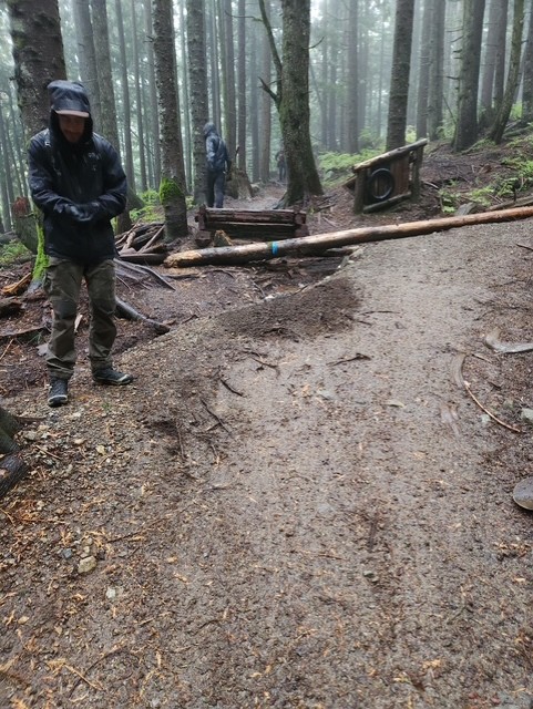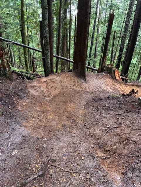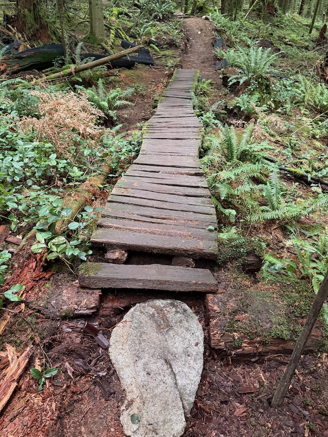 Small grade reversal to very muddy corner. Built new water drainage on said corner. The bulk of the time was spent rebuilding a wooden bridge feature, after the skinny. Planted ferns on either side of skinny. Helped drainage of puddles. Added a few rocks and dirt on exit of wooden features. Thanks for the wood prep Trail Crew!!!!