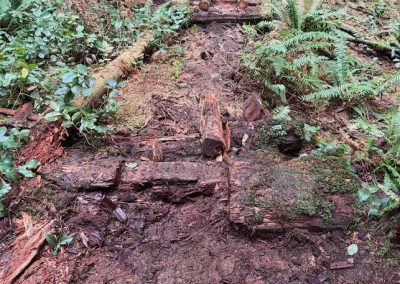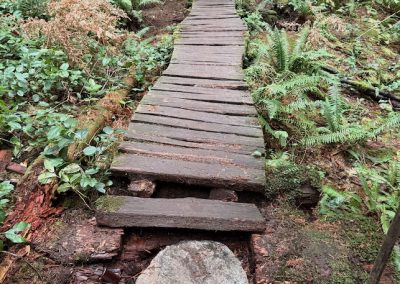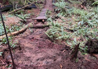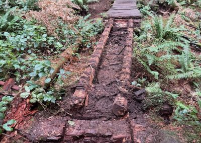 Another 3m of long rotten bridge was removed and replaced with trail tread of mineral soil sourced from the trail surface. The site was cleaned up, including cutting up rotten stringers and stacking slats and other materials. A further 3m of bridge on the west end was removed, with the remaining section to be replaced by a new 3–4m cedar bridge over the drainage. Exposed tread has been rebuilt with mineral soil from the existing trail surface.