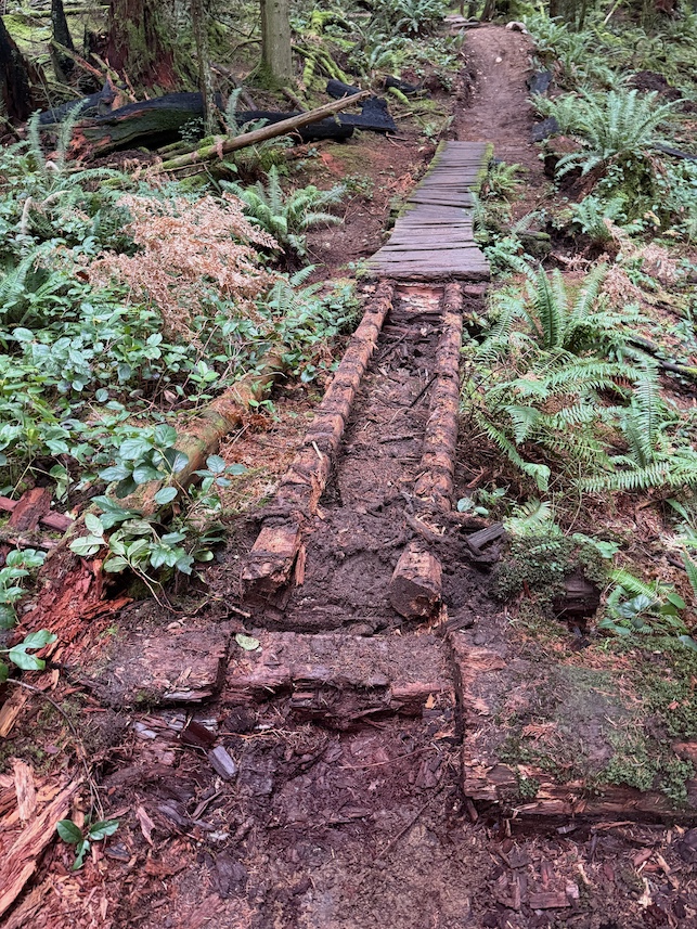 Damian McKevitt has been working on replacement of long bridge sections (rotten stringers, rotten/missing slats) with a dirt trail surface, with a shorter bridge planned over the natural drainage feature.