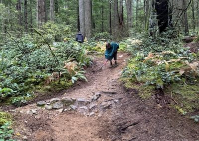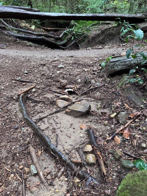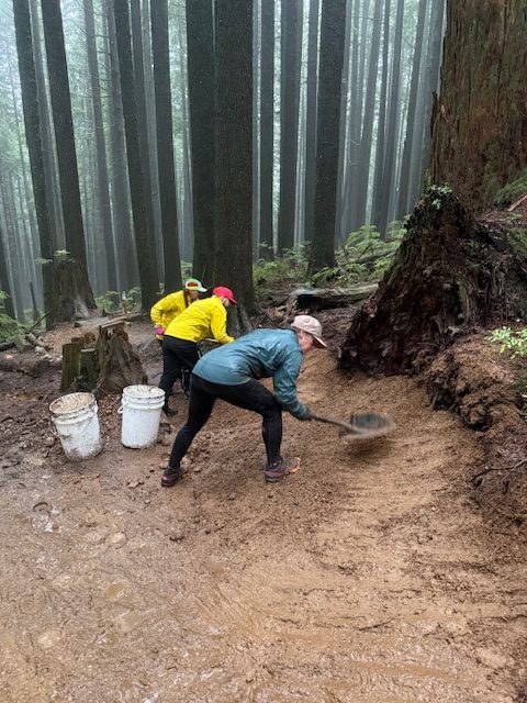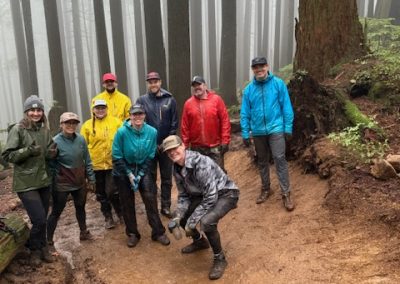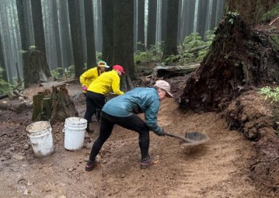 Trail work in preparation for rain. Volunteers winterized bottom third of trail for rainy season. Cleared organic debris from trail surface and restored downslope and trail grades to aid water runoff. Cleared drains and ensured adequate downslope drainage. Repaired eroded areas using rock and mineral soil mixture, and recrowned trail surface.