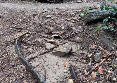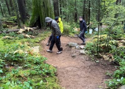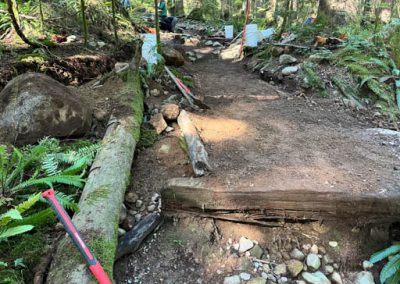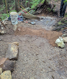 Pangor work required a trail junction relocation, shifting approx 3 feet uphill, to align with a natural slope in the hardpan and change from a sharp turn in an abrupt descant to a more gradual one that aligns better with the following rockwork. Cribbing added to raise the trail bed and divert water into a new drainage ditch before the final drop