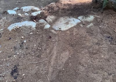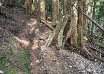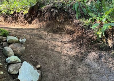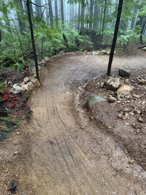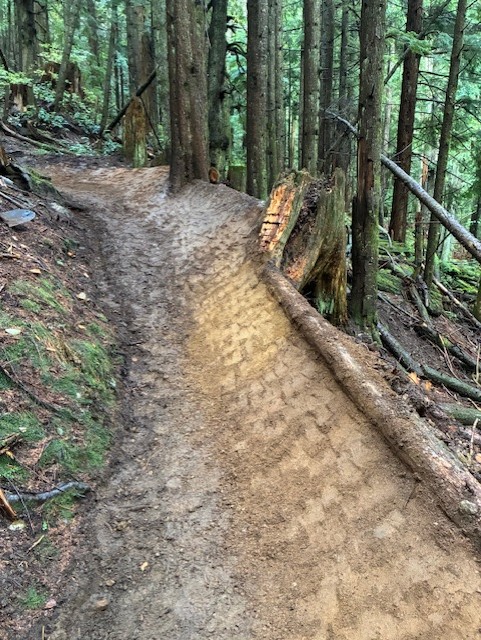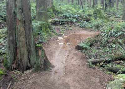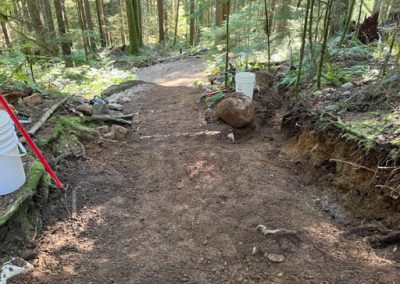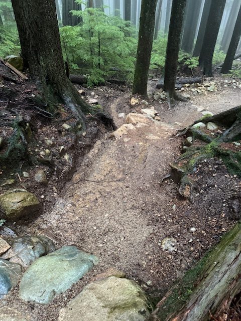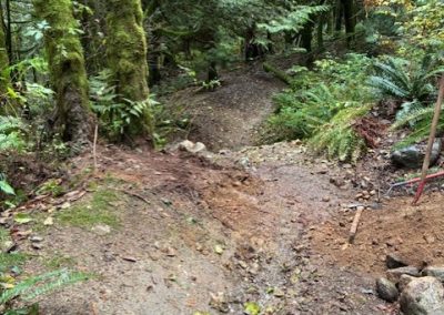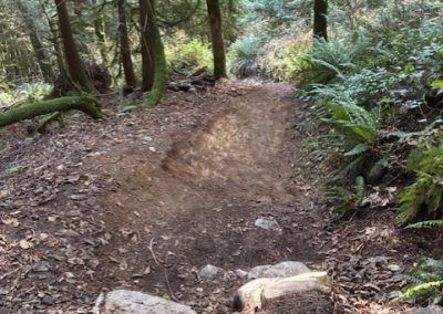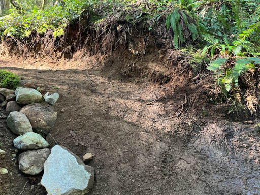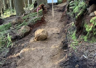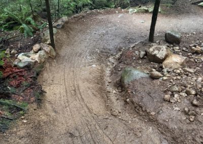 Maintained trail tread at the rock roll exit. Armoured trail tread with rock and topped with mineral soil.