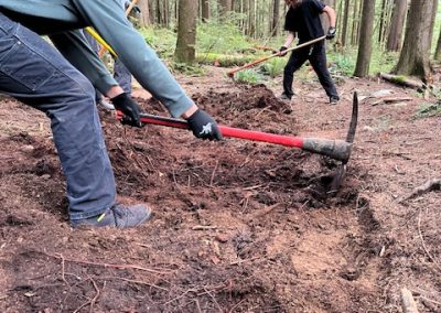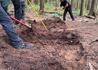 Another Steed Cycles’ volunteer day resurfaced trail tread and improved drainage systems throughout Pennzoil. Mineral soil was added and shaped to riding surface to prevent downslope water flow and promote runoff. Focused work around the Braemar trail intersection, adding drainage and material to both trails at the junction. Built up and shaped trail tread to direct water into maintained drainage points.