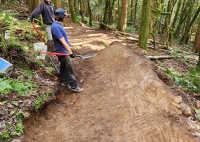Continuing construction of new climbing trail. Working to remove vegetation and organic dirt, shaping mineral dirt to form the trail and using rocks for filling holes and retaining walls. Approximate status: 100m of completed trail, 100m of 90-95% complete trail, 100m unstarted trail