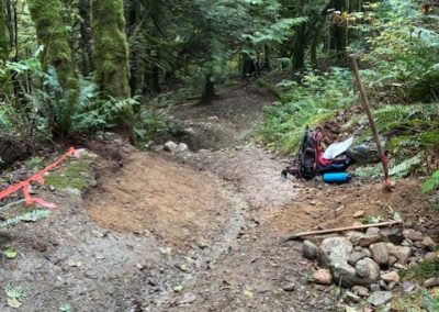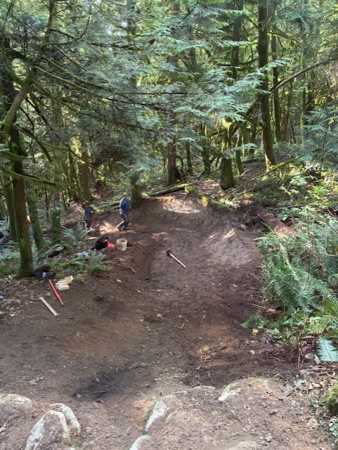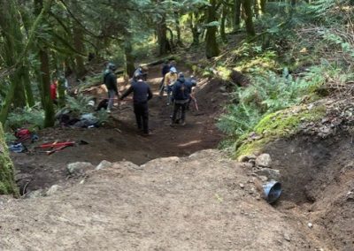 Drop # 3 A pipe was added across the trail to deal with the drainage. The pipe was then rocked in, and the whole trail bed was raised. The Big Berm. Completely rebuilt and extended. A small shark fin was added, allowing the rider to jump over the drainage ditch. Great turnout the work on Mystery DH. A big thank you to everyone who came out to dig.